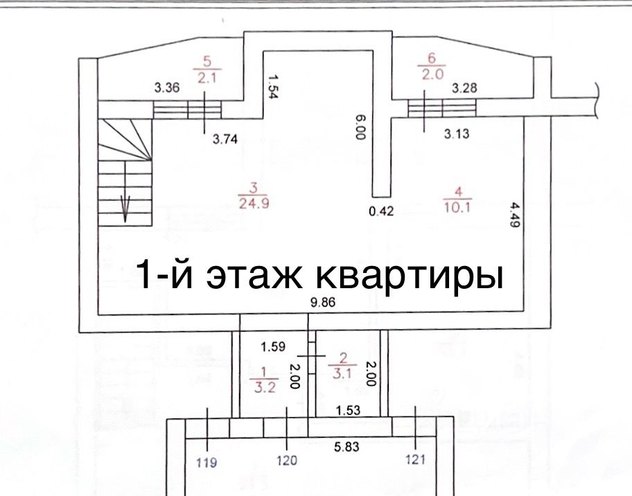 Удобная планировка квартиры, высота потолка от 2.6 до 5 метров. 1-й этаж: Прихожая 3.2 кв.м Санузел 3.1 кв.м Кухня - гостиная 25 кв.м Жилая комната 10.1 кв.м ДВЕ ЛОДЖИИ