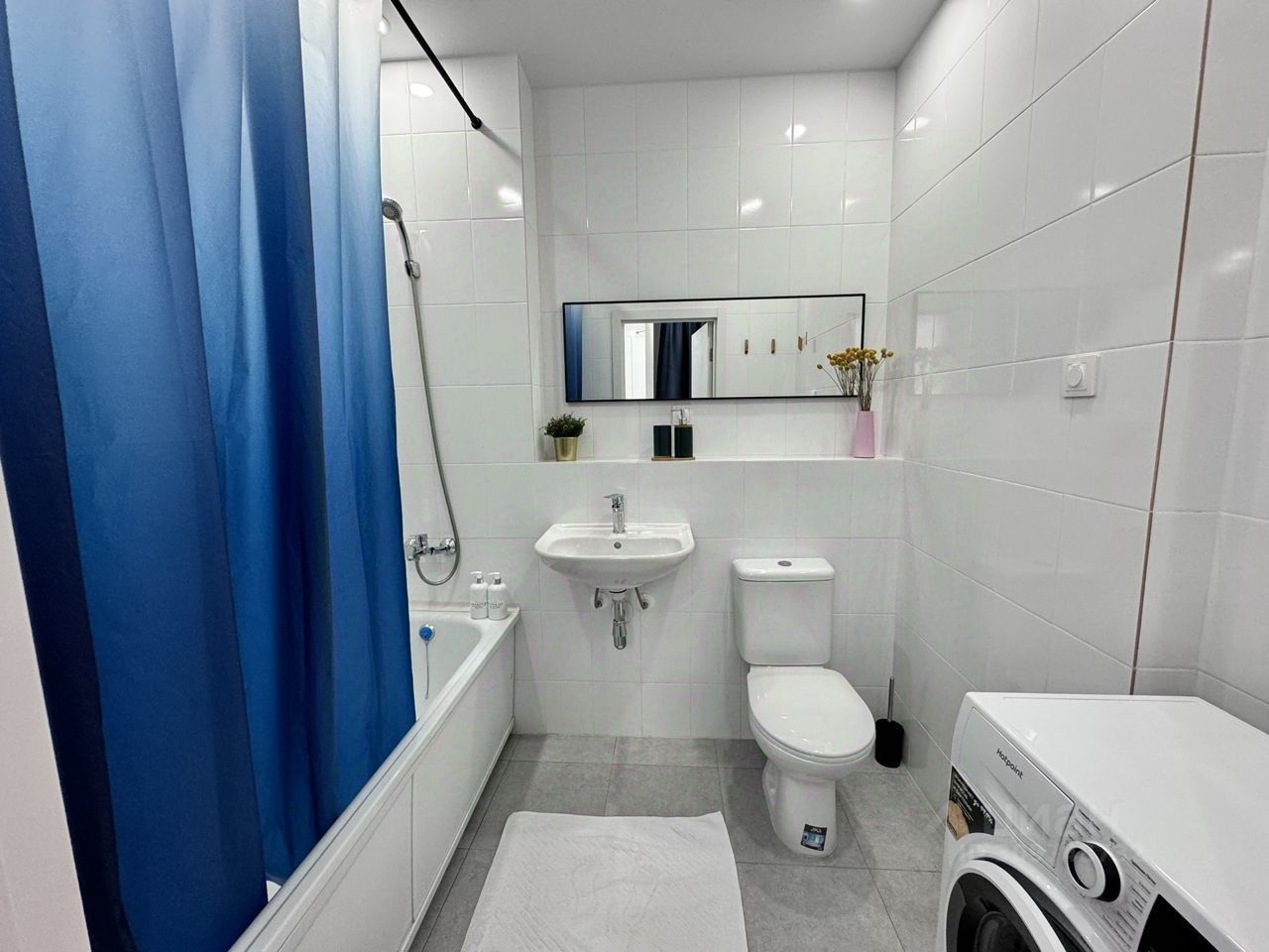 В стильной ванной комнате можно принять расслабляющую ванну. Также в ней есть фен и все необходимые мелочи.