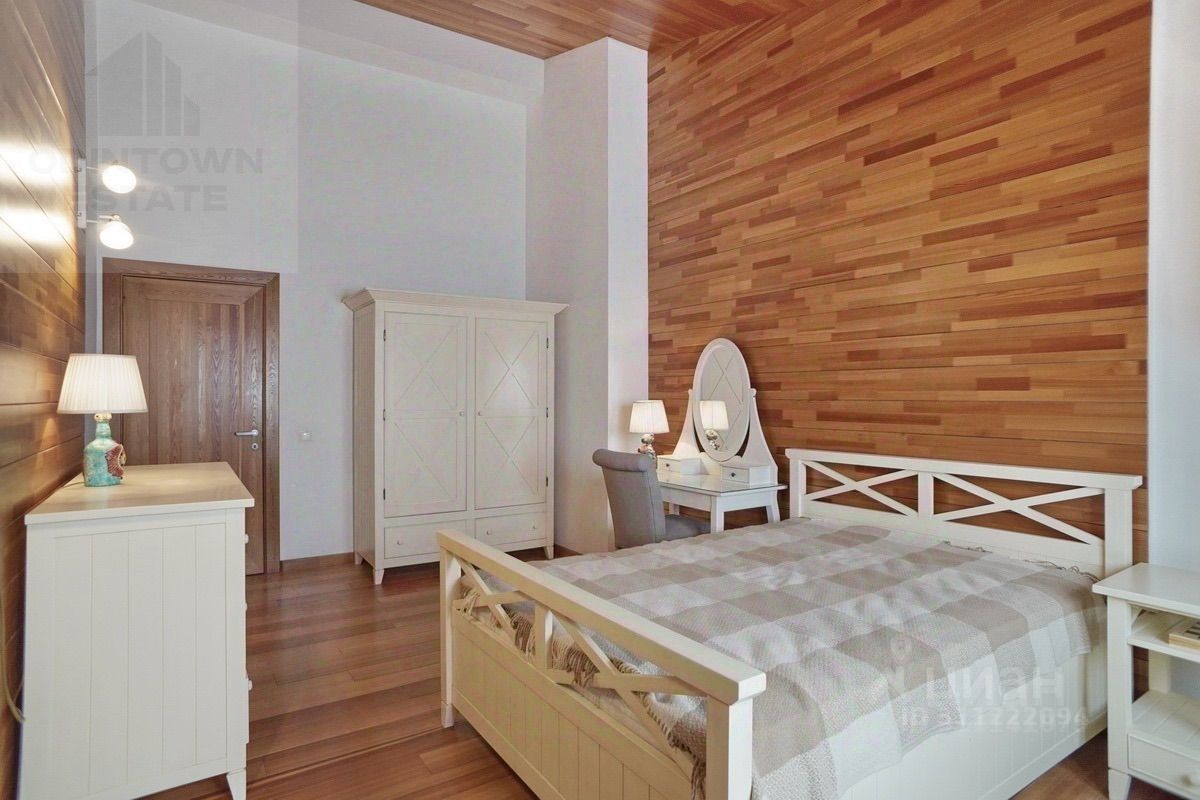 кухня-столовая 50м² с камином с функцией гриль-барбекю, гостиная 60м², 3 спальни: мастер-спальня с ванной комнатой 55м² и 2 спальни по 19м² с прилегающими с/у (в одной из спален в настоящее время оборудован кабинет), гардеробная 19м², теплые полы, кондиционирование, элегантная меблировка.