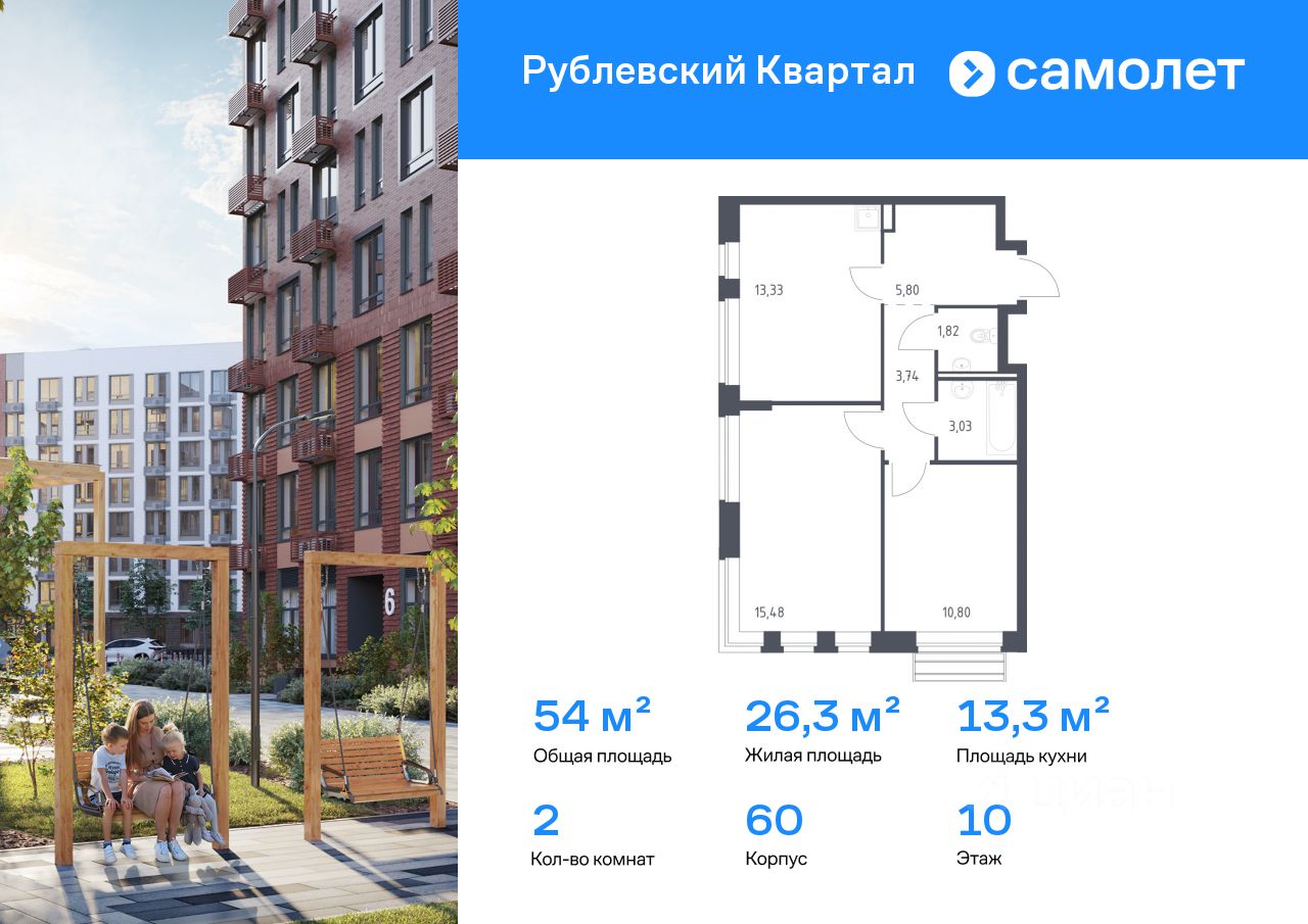 Строим кварталы для жизни с заботой о будущем. Предлагается 2-комнатная квартира комфорт-класса 54 кв.м в корпусе 60 на 10 этаже, в ЖК ''Рублевский Квартал'' Квартира с чистовой отделкой. Доступность дополнительных опций уточняйте у застройщика.