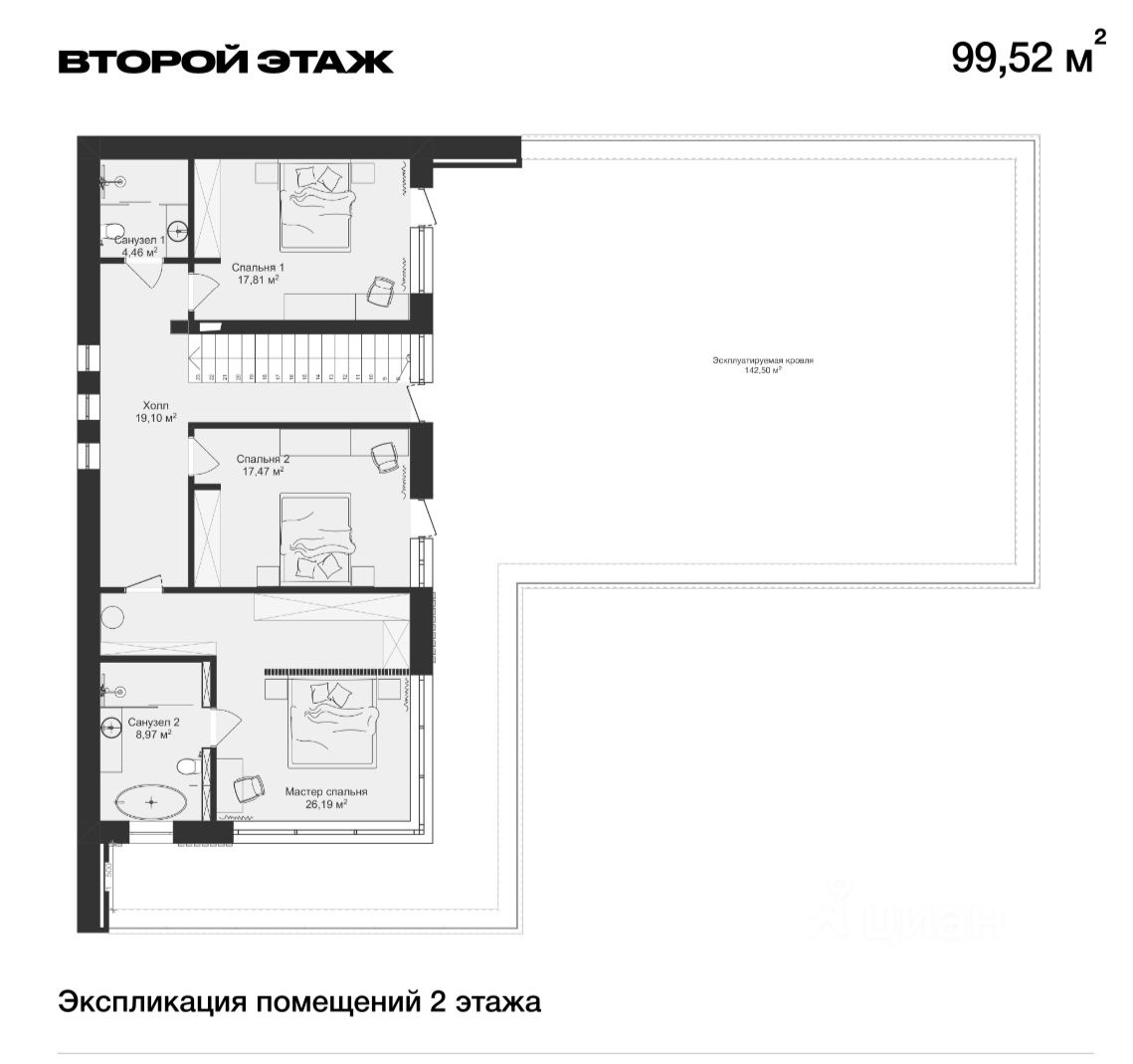 2 этаж - 3 мастер спальни, просторная терраса.