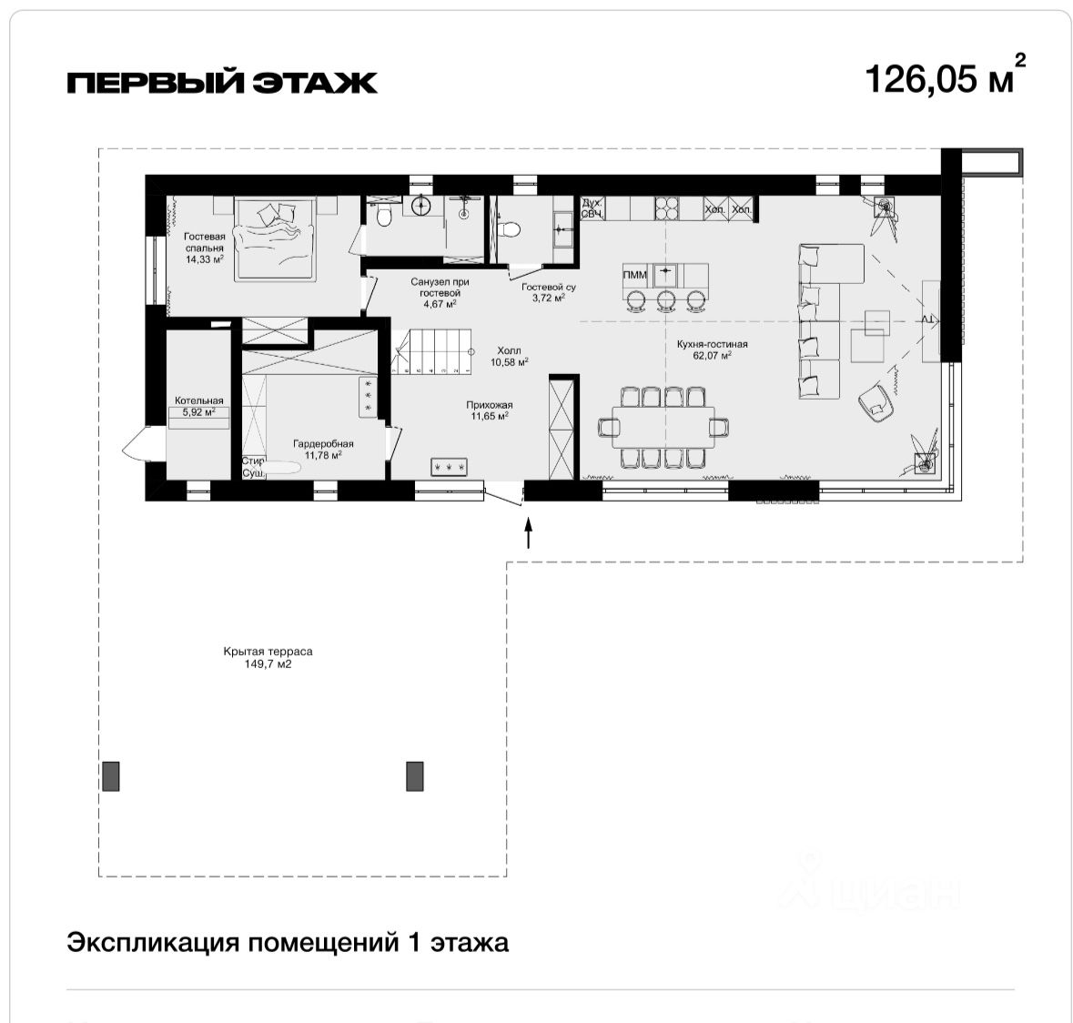 1 этаж - холл, кухня-гостиная, гардеробная, гостевая спальня, 2 с/у, терраса, котельная