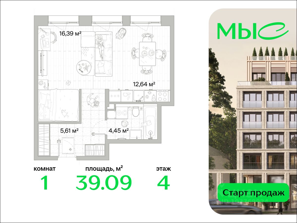 В продаже квартира площадью 39.09 кв. м без отделки на 4 этаже 10 этажного дома. Квартира находится в премиальном жилом комплексе ''МЫС'' (Застройщик - MR Group).