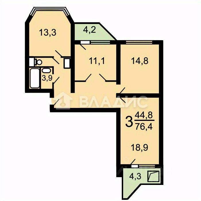 Общая площадь квартиры — 81 квадратный метр, из них 46 метров — жилая площадь, 12,9 метра — кухня. Высота потолков — 2,7 метра. В квартире два балкона.