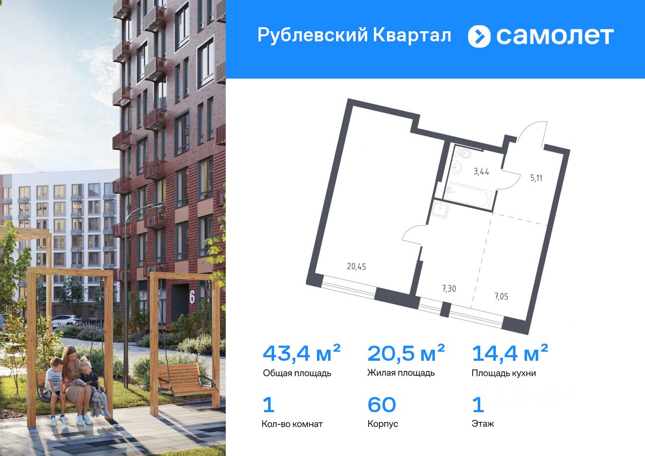Строим кварталы для жизни с заботой о будущем. Предлагается 1-комнатная квартира комфорт-класса 43,35 кв.м в корпусе 60 на 1 этаже, в ЖК ''Рублевский Квартал'' Квартира с чистовой отделкой. Доступность дополнительных опций уточняйте у застройщика.