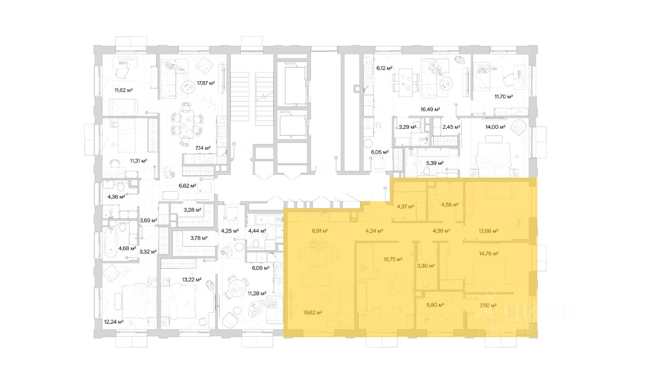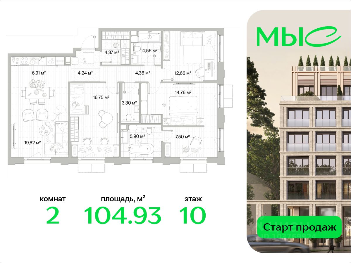 В продаже квартира площадью 104.93 кв. м без отделки на 10 этаже 10 этажного дома. Квартира находится в премиальном жилом комплексе ''МЫС'' (Застройщик - MR Group).