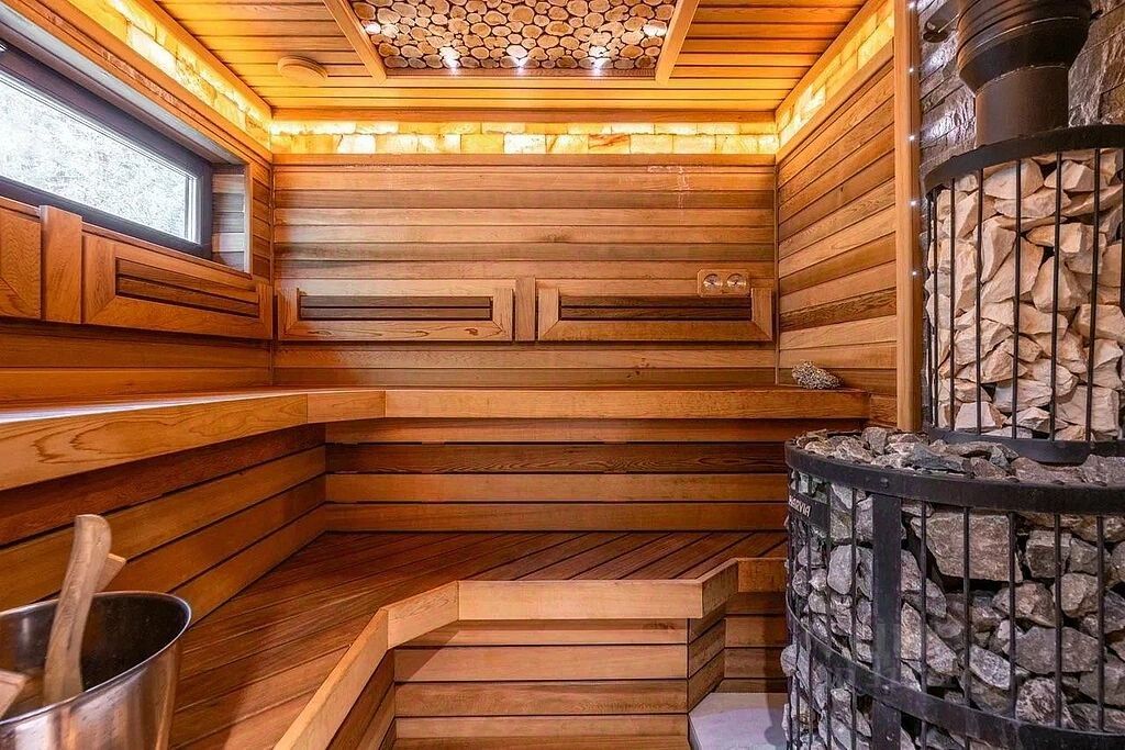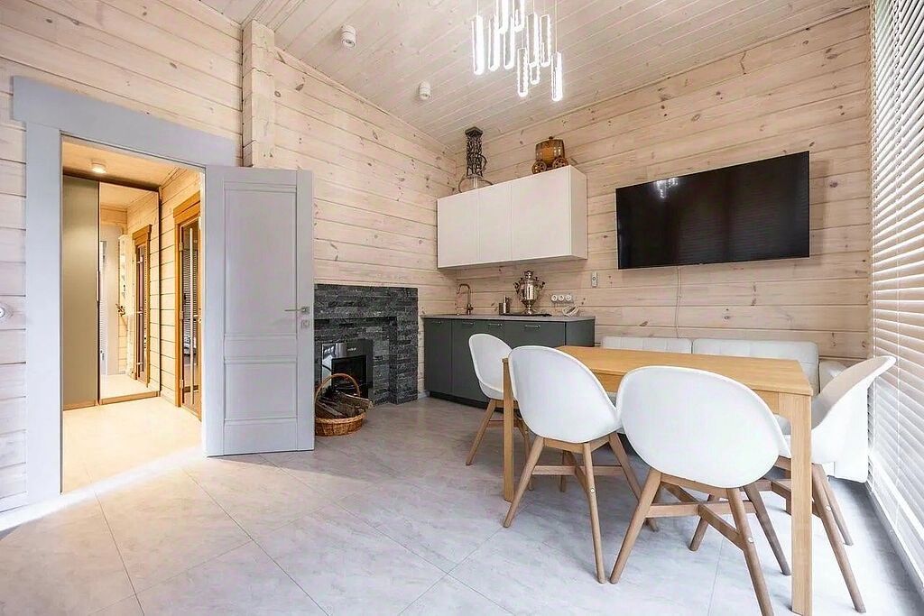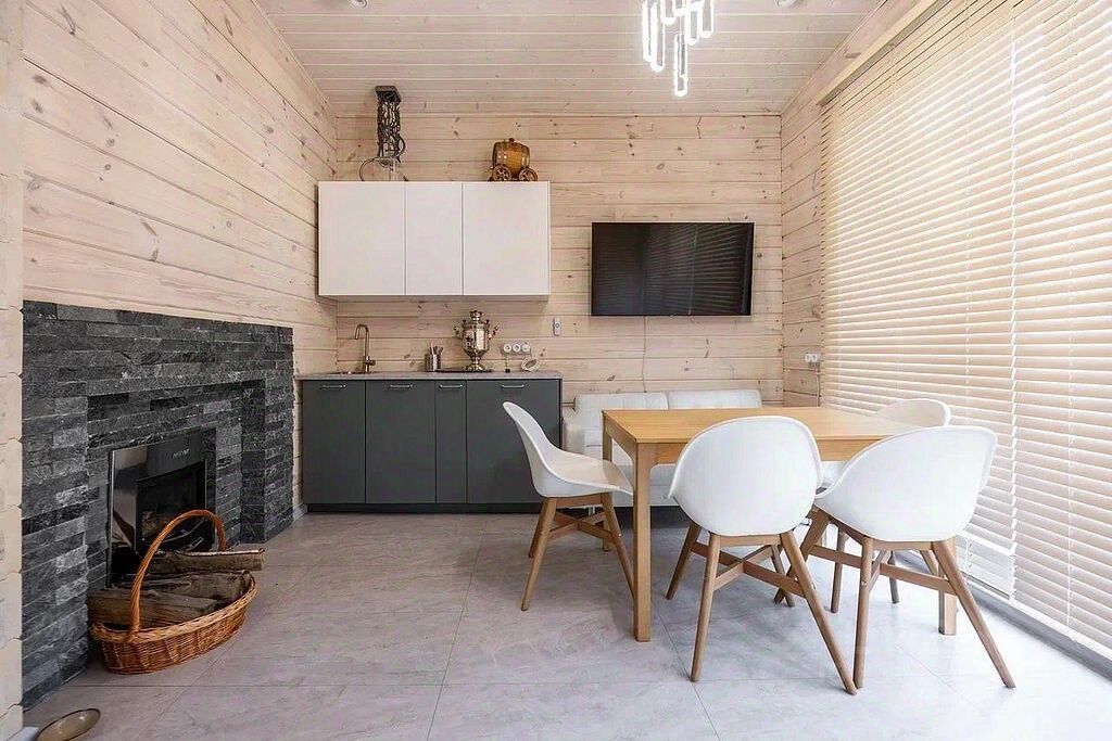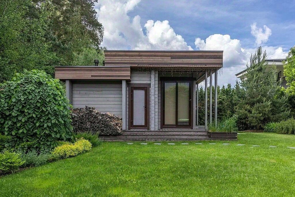 Отдельно стоящая постройка включает сауну, кухню и санузел, создавая дополнительное пространство для отдыха и развлечений.