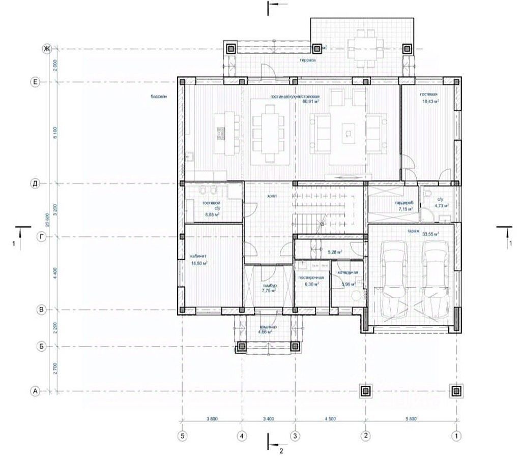 1 этаж - холл, кухня-столовая-гостиная, гостевая спальня со своим с/у и гардеробной, гостевая спальня, санузел, постирочная, бойлерная, терраса, гараж на 2 автомобиля,