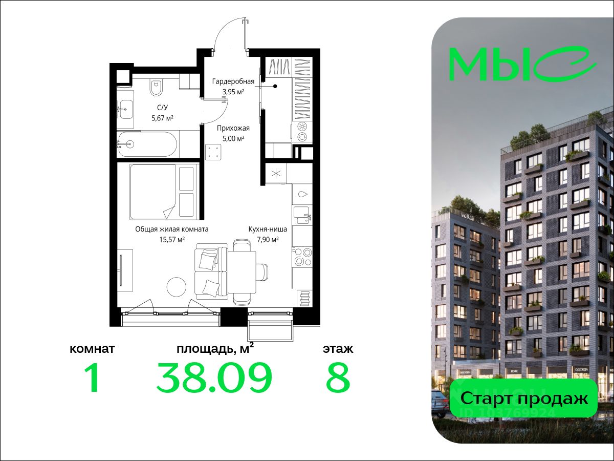 В продаже квартира площадью 38.09 кв. м без отделки на 8 этаже 8 этажного дома. Квартира находится в премиальном жилом комплексе ''МЫС'' (Застройщик - MR Group).