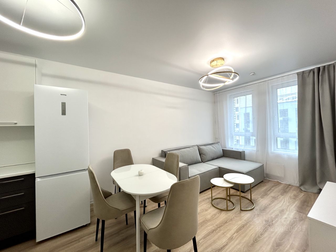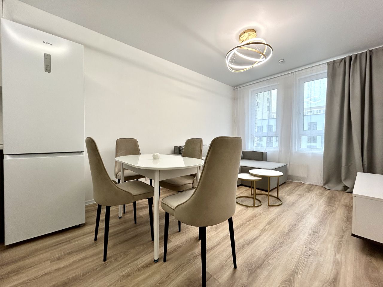 ЖК Горки Парк Уединенный жилой комплекс и приватный двор без машин. Впервые предлагается в аренду на длительный срок трехкомнатная квартира евроформата 56.2 кв.м. Планировочное решение: кухня-столовая-гостиная + 2 изолированные комнаты, холл, санузел совмещенный, постирочная комната. Установлен кухонный гарнитур со встроенной бытовой техникой Korting - керамическая независимая варочная панель, духовой шкаф, посудомоечная машина, вытяжной шкаф, холодильник. Всё новое! Дом расположен в районе с развитой инфраструктурой, рядом расположен Коробовский лесопарк благоустроенными экотропами, пруд. В пешей доступности: школы и детские сады, продуктовые супермаркеты, ретейлы, кафе, аптеки и медицинские учреждения.