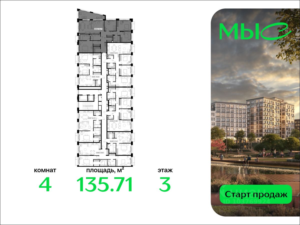 В продаже квартира площадью 135.71 кв. м без отделки на 3 этаже 12 этажного дома. Квартира находится в премиальном жилом комплексе ''МЫС'' (Застройщик - MR Group).