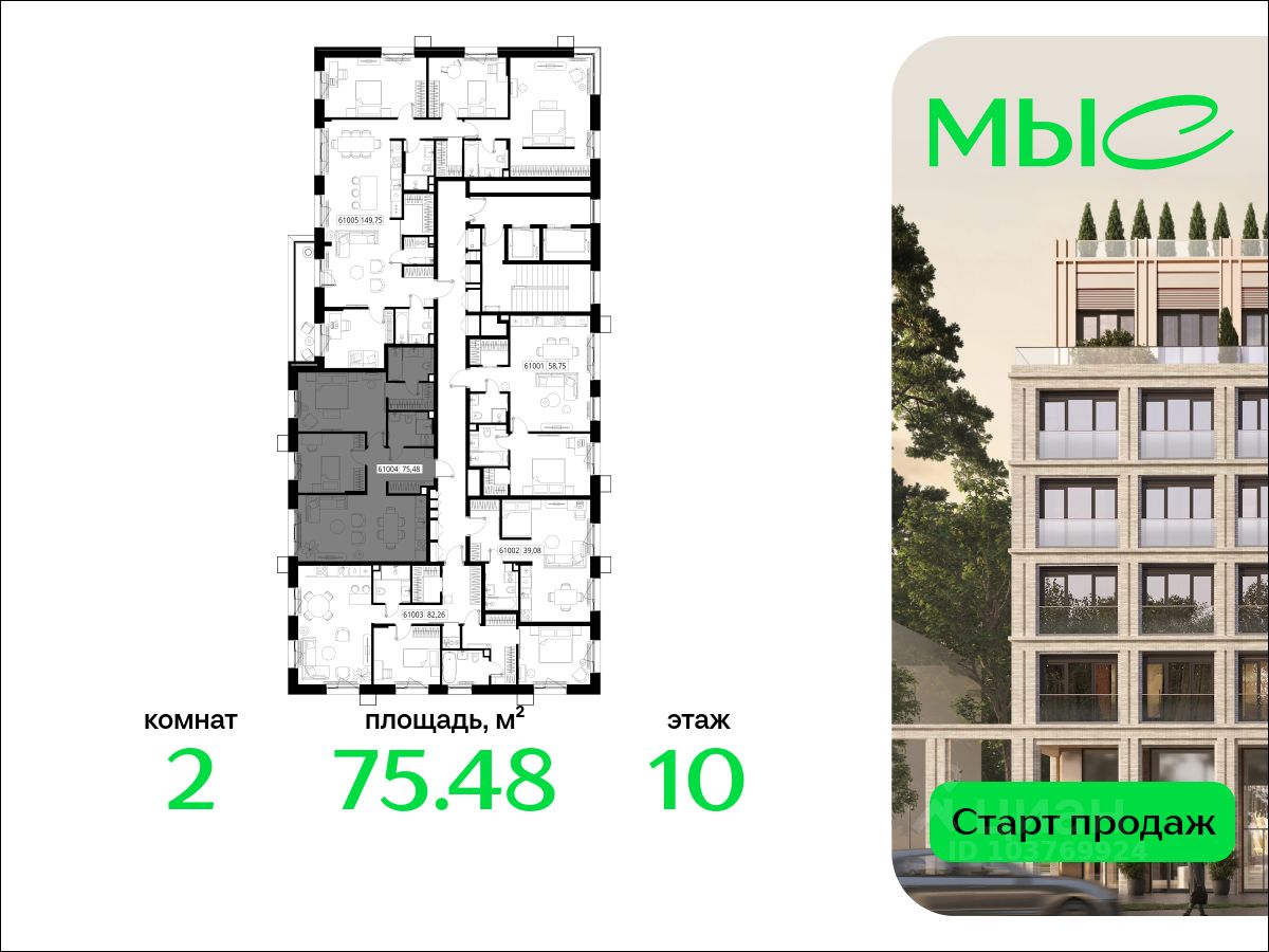 В продаже квартира площадью 75.48 кв. м без отделки на 10 этаже 10 этажного дома. Квартира находится в премиальном жилом комплексе ''МЫС'' (Застройщик - MR Group).