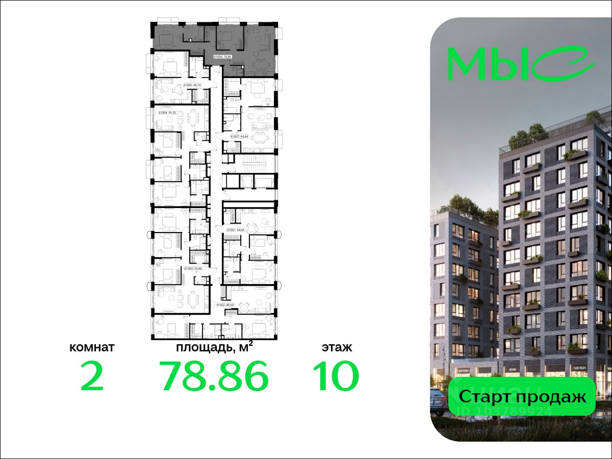 В продаже квартира площадью 78.86 кв. м без отделки на 10 этаже 12 этажного дома. Квартира находится в премиальном жилом комплексе ''МЫС'' (Застройщик - MR Group).