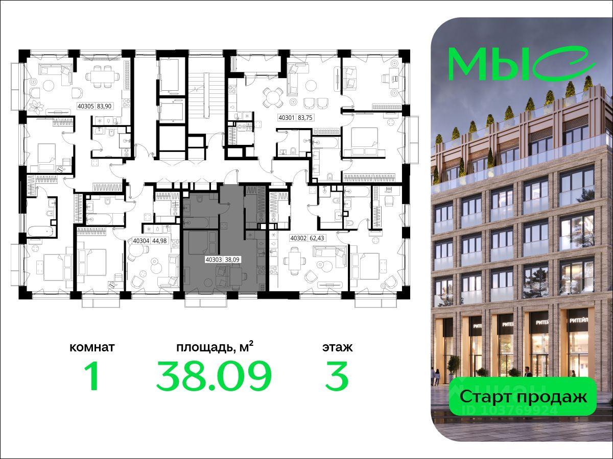В продаже квартира площадью 38.09 кв. м без отделки на 3 этаже 8 этажного дома. Квартира находится в премиальном жилом комплексе ''МЫС'' (Застройщик - MR Group).