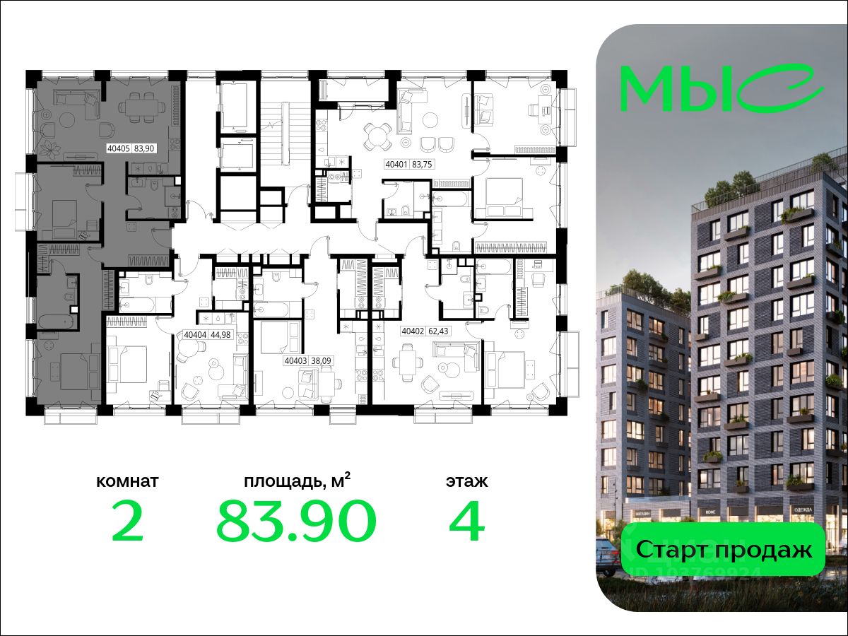 В продаже квартира площадью 83.90 кв. м без отделки на 4 этаже 8 этажного дома. Квартира находится в премиальном жилом комплексе ''МЫС'' (Застройщик - MR Group).