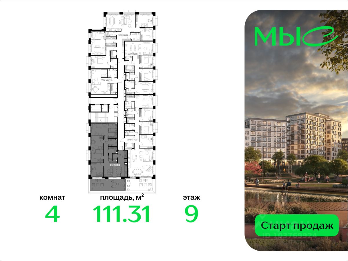 В продаже квартира площадью 111.31 кв. м без отделки на 9 этаже 12 этажного дома. Квартира находится в премиальном жилом комплексе ''МЫС'' (Застройщик - MR Group).