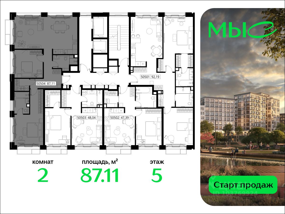 В продаже квартира площадью 87.11 кв. м без отделки на 5 этаже 6 этажного дома. Квартира находится в премиальном жилом комплексе ''МЫС'' (Застройщик - MR Group).
