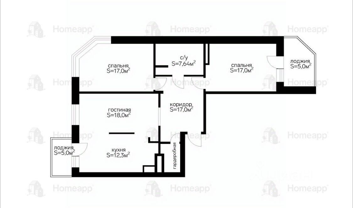 Согласно планировке в квартире: кухня-гостиная 32м, 2 спальни, гардеробная, санузел, просторный холл, 2 квадратные 5-метровые лоджии со светом и розетками.