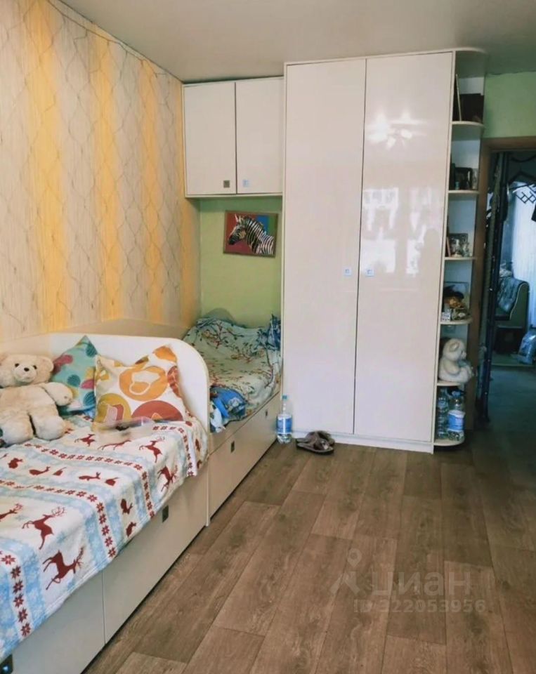 в спальне двуспальная кровать, в комнате 2 односпальные кровати и одна трансформер (складная). Много мест хранения для одежды.