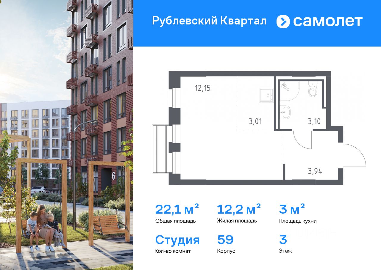 Строим кварталы для жизни с заботой о будущем. Предлагается квартира студия комфорт-класса 22,1 кв.м в корпусе 59 на 3 этаже, в ЖК ''Рублевский Квартал'' Квартира с чистовой отделкой. Доступность дополнительных опций уточняйте у застройщика.