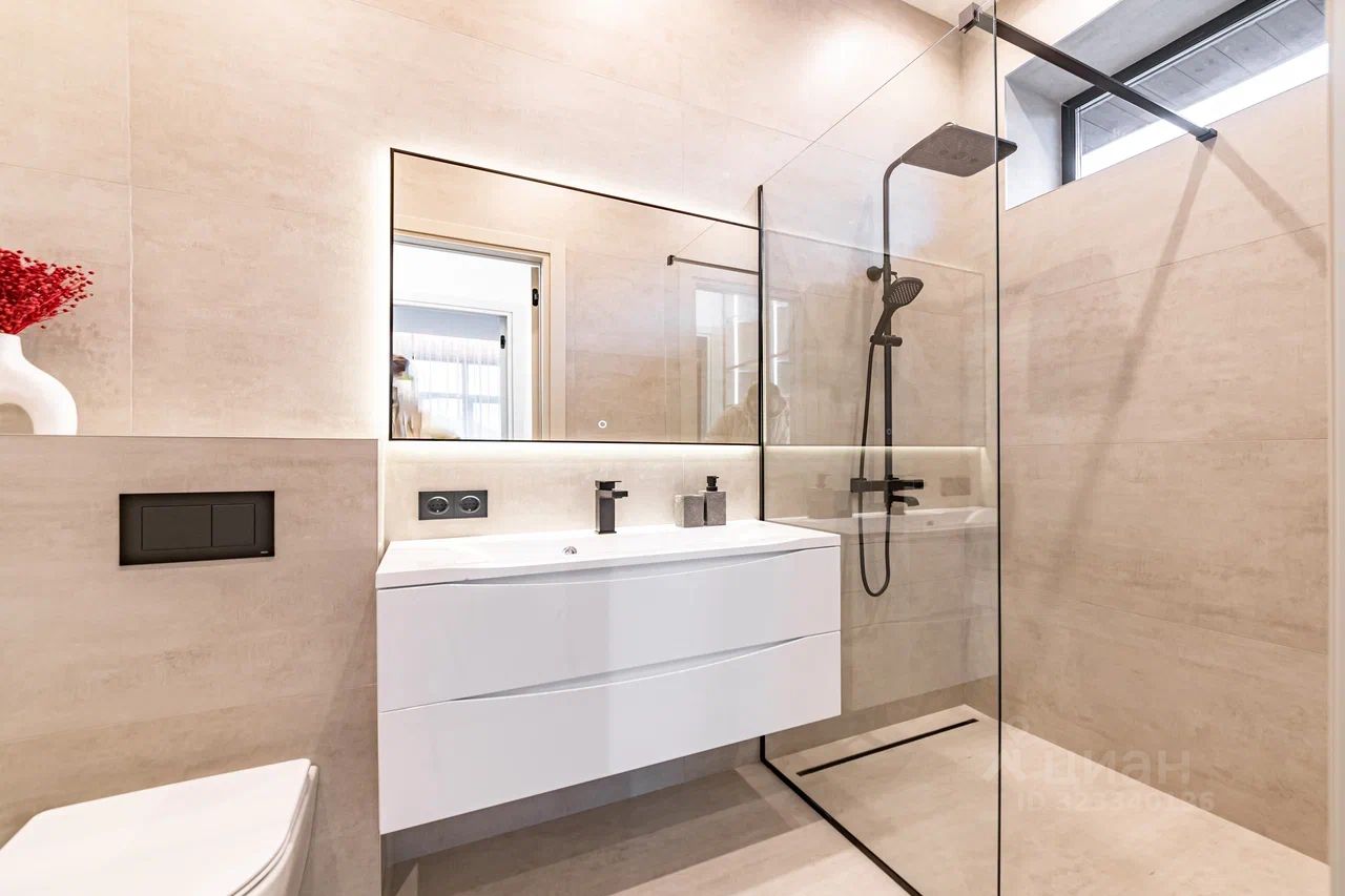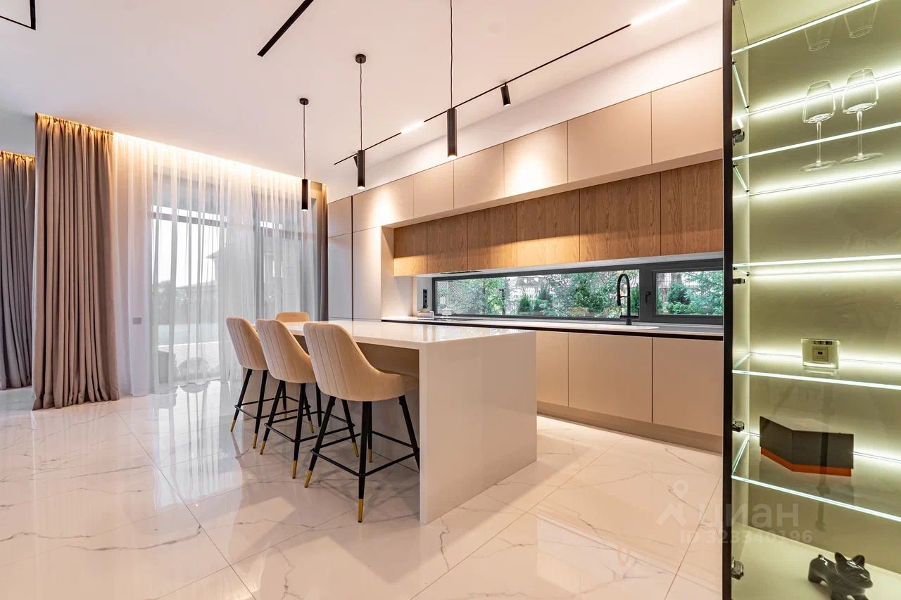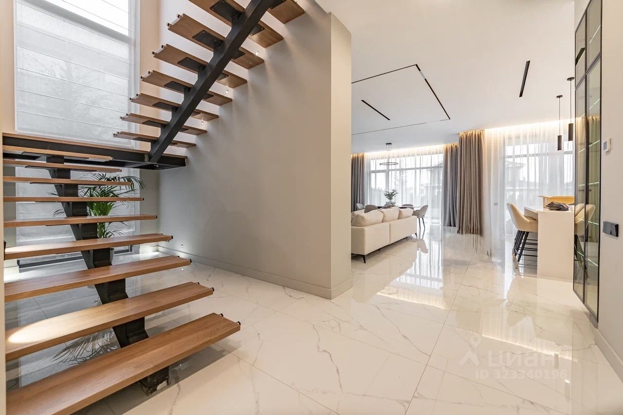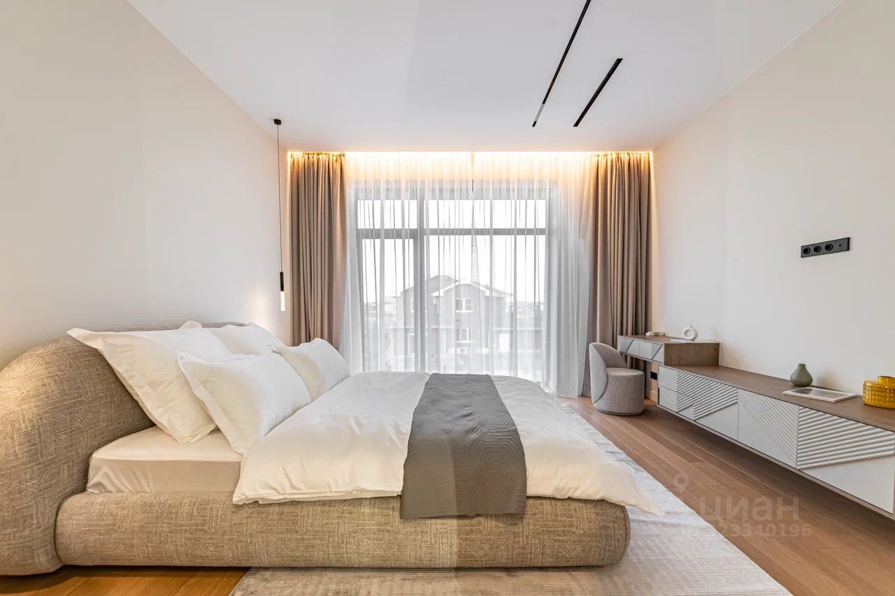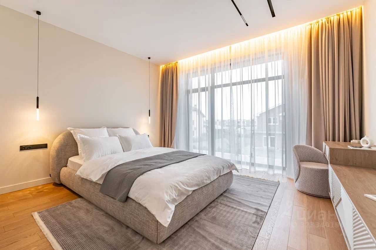Дом характеризуется высокими потолками и огромными окнами в пол, что создает ощущение простора и наполняет помещения естественным светом. В качестве дополнительного удобства - собственная финская сауна, где можно расслабиться после насыщенного дня.