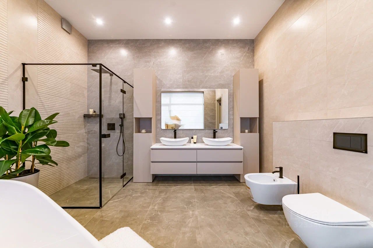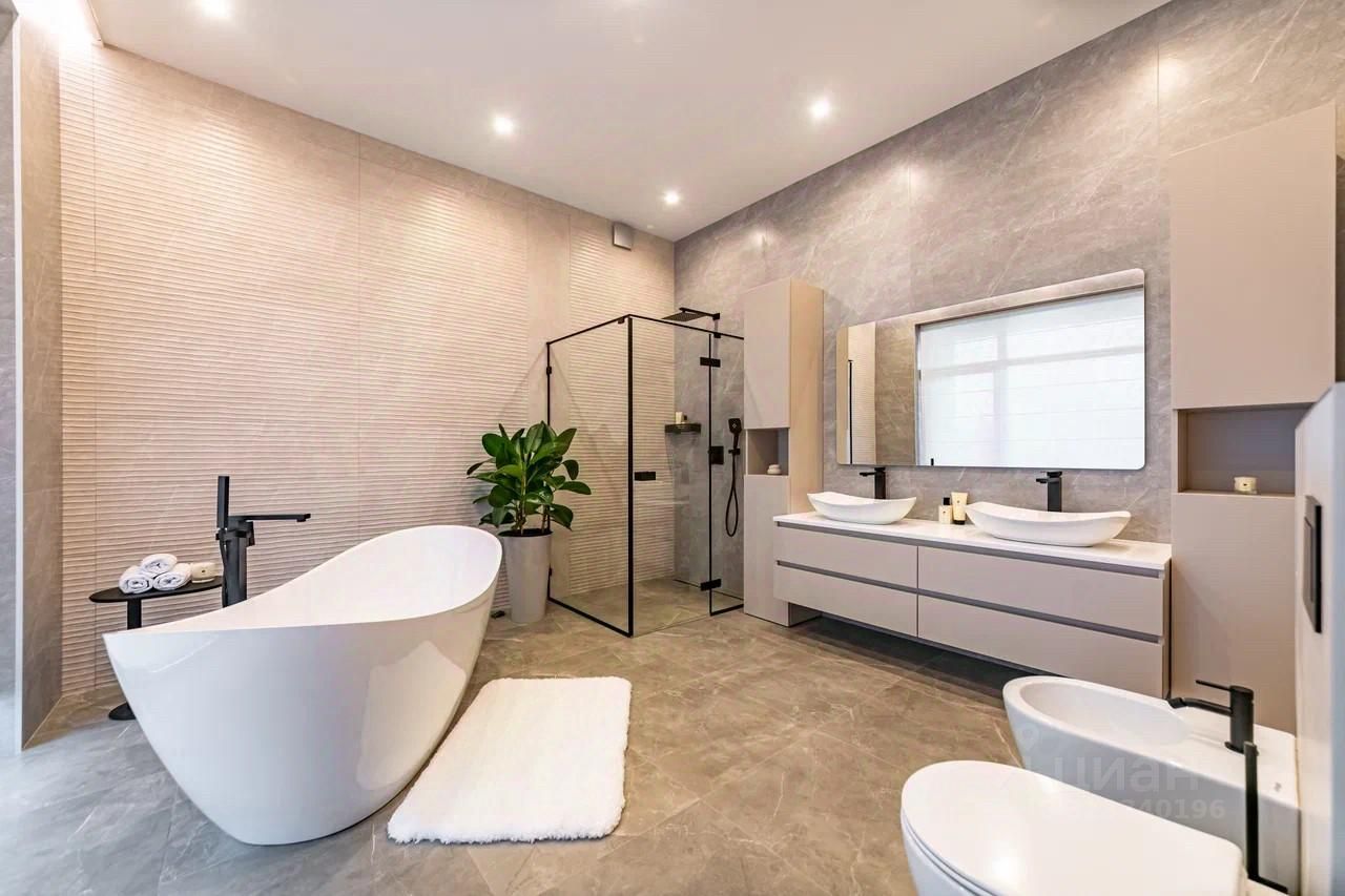 Этот уникальный объект недвижимости выделяется качественной отделкой и продуманной планировкой, идеально подходящей для комфортной жизни. Внутреннее пространство включает просторную кухню-гостиную, четыре уютные спальни, каждая из которых оборудована отдельным санузлом и гардеробной. С террасы открывается вид на ухоженный участок, где предусмотрен навес для двух автомобилей.