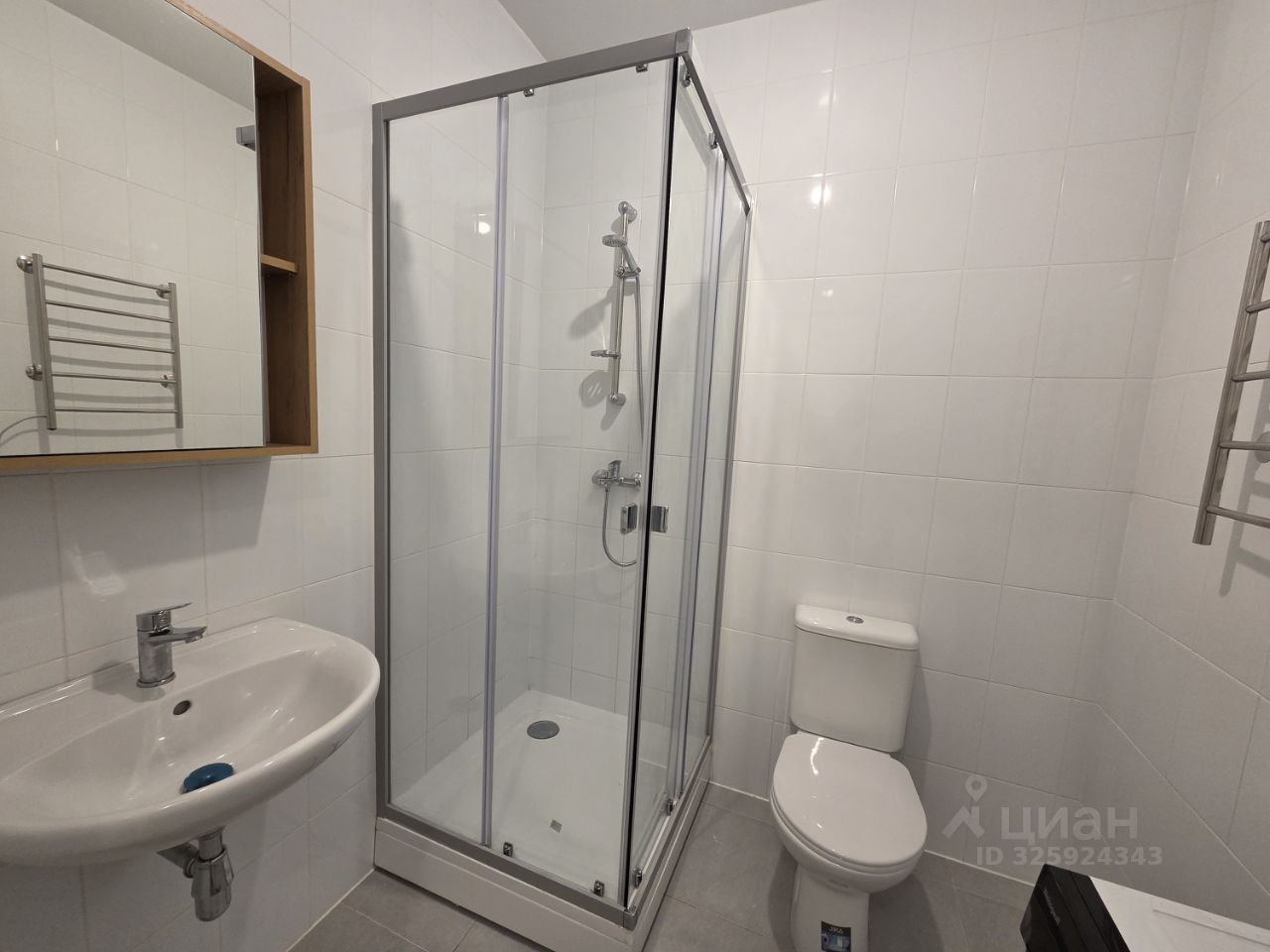 Санузел совмещенный, с душевой кабиной и современной сантехникой. В прихожей установлен шкаф для хранения вещей.