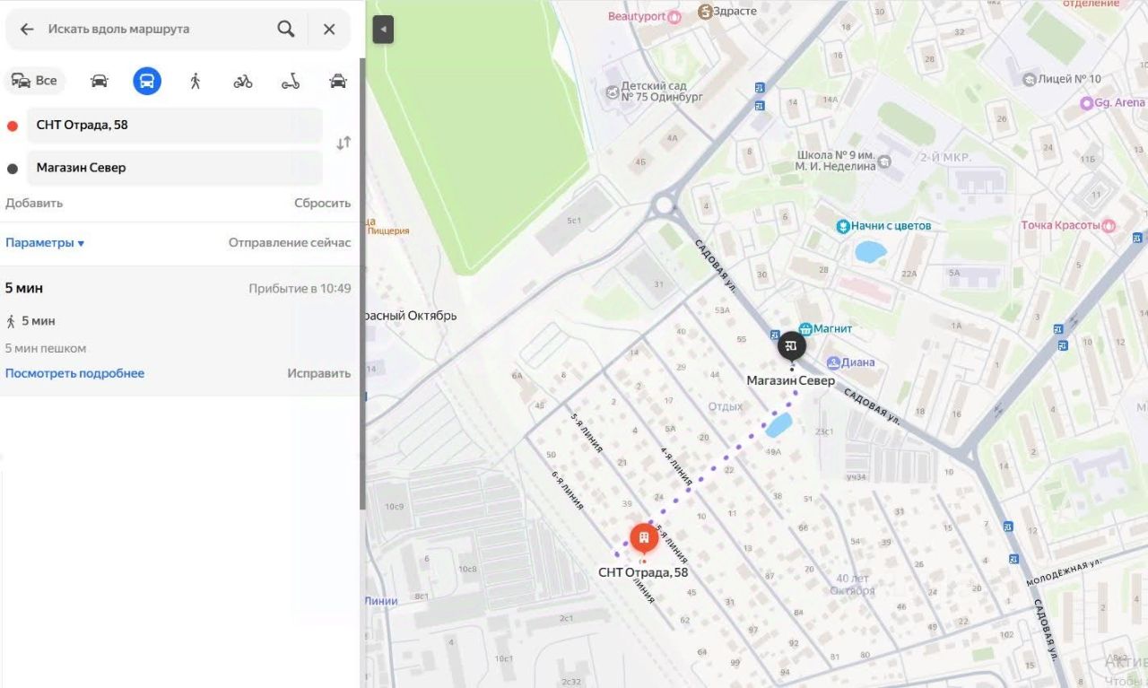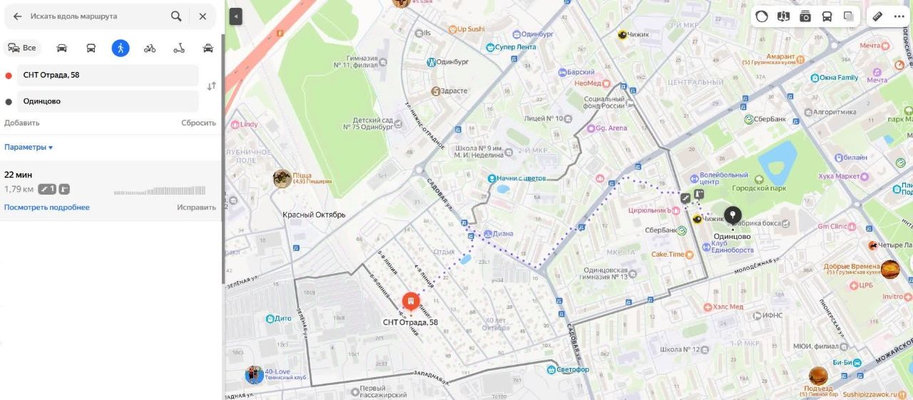 5 минут пешком через СНТ до автобусных остановок на Садовой улице, 22 минуты пешком до центра Одинцово или станциии Отрадное Белорусского направления.